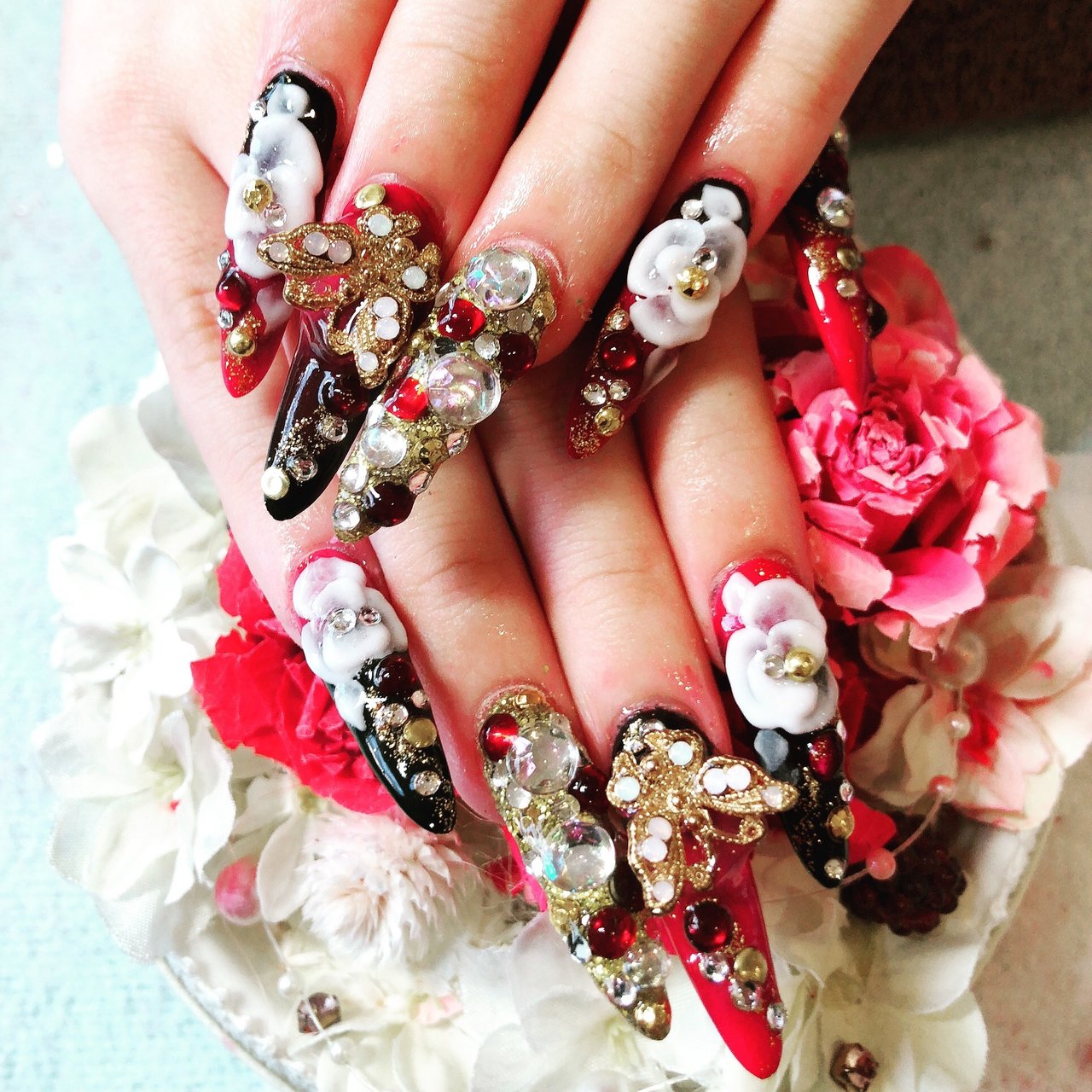 メルカリ 成人式ネイル 赤 黒 花ネイル 成人式 ネイルチップ